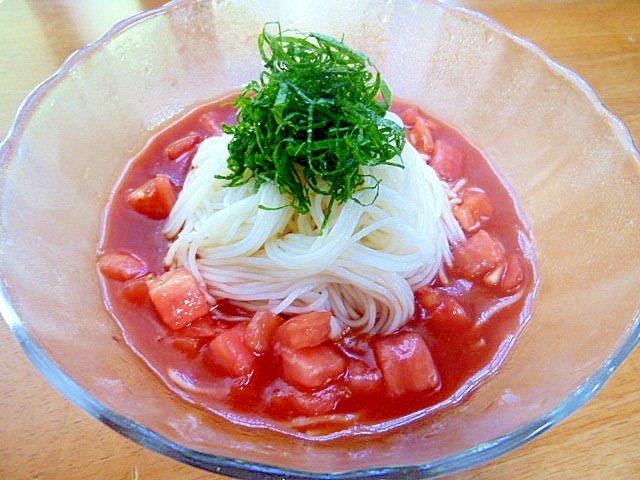 · ぶっかけトマトそうめん 材料(2人分) トマトジュース(無塩) 1缶(約190g)、とりささ身 小2本、みょうがの小口切り 1個分、万能ねぎの小口切り 2本分、そうめん 3束、めんつゆ(2倍濃縮) 大さじ4、酒、塩 作り方 · トマトジュースと麺つゆ、トマト缶で作ったつゆをかけたら、きゅうりをのせましょう。 冷しゃぶ乗っけの超簡単トマトそうめん by 中村有加利 トマトジュースとめんつゆで超簡単、お肉が乗ったスタミナぶっかけそうめんです。2407 · トマトジュースで簡単!ガスパチョ風そうめんつゆ トマトの冷製スープ「ガスパチョ 」をトマトジュースを使ってそうめんつゆにアレンジしました。細かく切ったきゅうりがそうめんに絡んで食感のアクセントになっています。