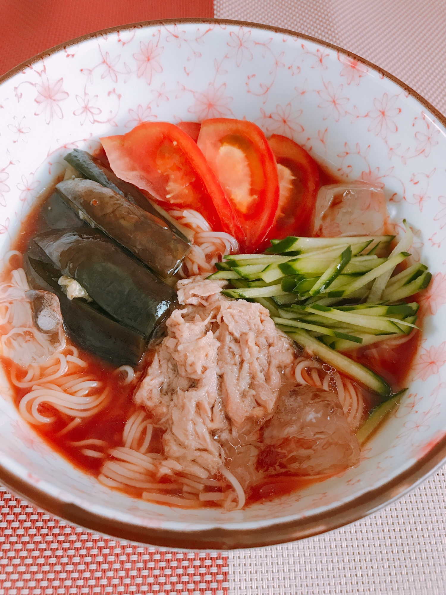 トマトジュースで 冷たいトマトそうめん ハナウタゴハン